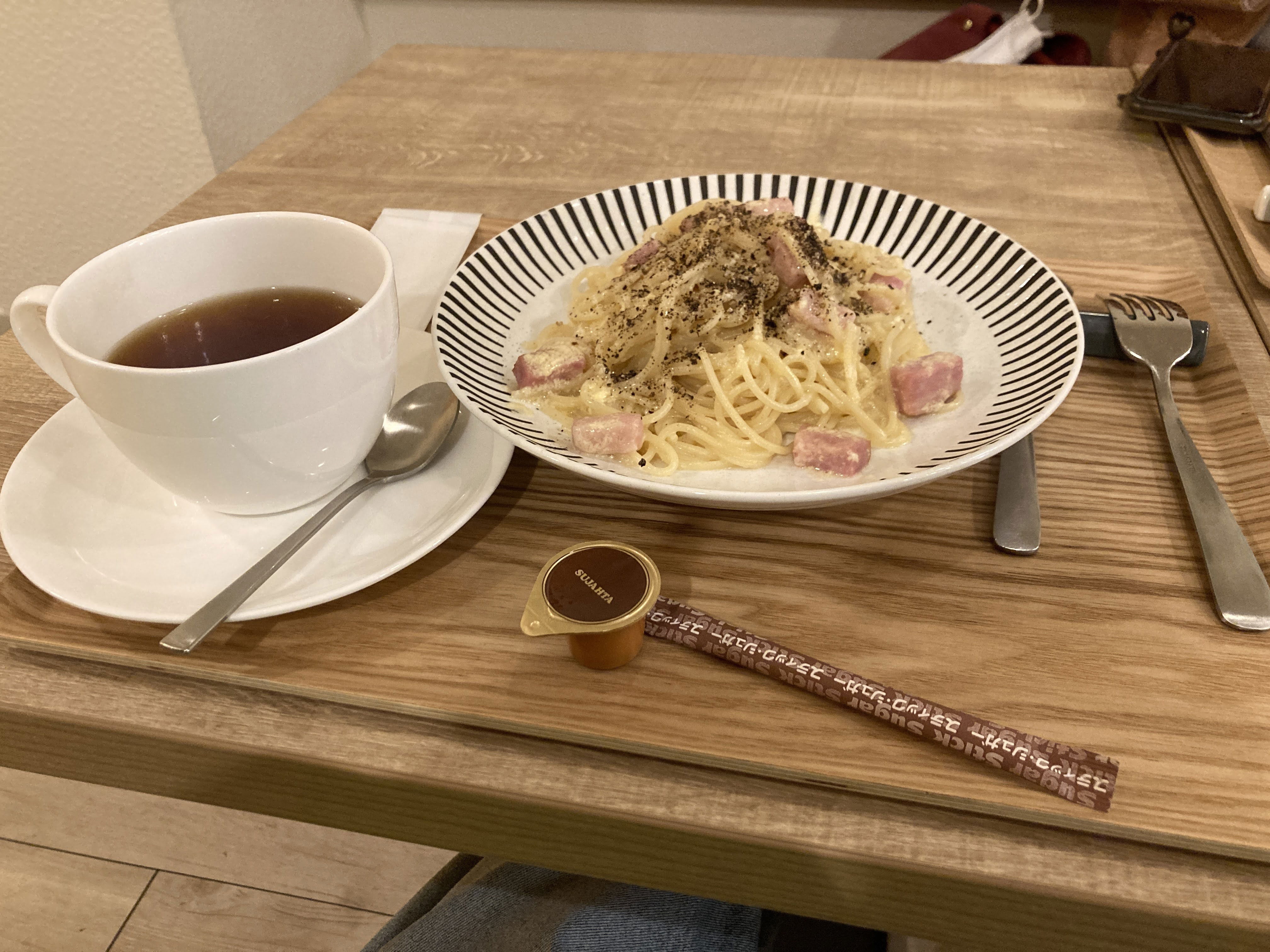 こちらのお店の紅茶カルボナーラがとてもおすすめでいつもお昼に行った時はまず紅茶を頼んでいますね笑